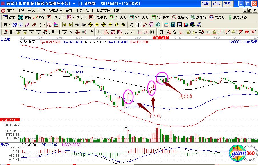 當(dāng)然買入之后就需要注意觀察個股的賣出獲利點,因為股市有漲有跌才是正常的操作規(guī)律,所以在股價上漲一波行情之后,要分析其中的賣出點,如圖在向上突破藍(lán)色下軌線是一個試探性建倉的點位,在突破生命線進入強勢運行區(qū)域是一個不錯的買入點位置,也可以適當(dāng)?shù)倪M行加倉操作,之后在股價向上運行沒有突破藍(lán)色上軌線,并出現(xiàn)下跌回調(diào)的時候,要注意及時的賣出獲利。因為站穩(wěn)一線看高一線是極反通道使用的基本規(guī)則。