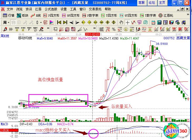 西藏發(fā)展(000752)在2011年初的股價走勢,前期經(jīng)歷了一波高位橫盤的地量走勢,是一個賣出的信號,如果沒有賣出,可以繼續(xù)觀察后期的走勢,在2月1日的時候形成了谷底地量的形態(tài),對應(yīng)的成交量是低量,并且形成的是十字星的變盤信號,macd指標(biāo)形成的是金叉買入的信號,投資者可以積極的進(jìn)行買入操作。