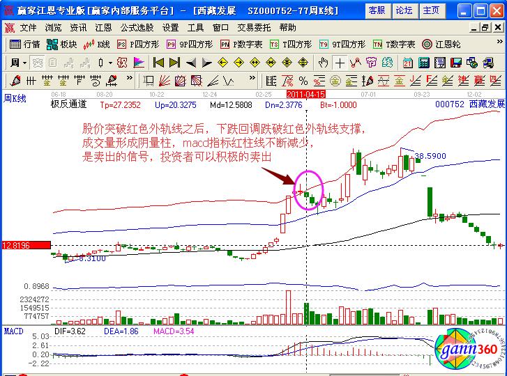 在投資者介入之后,必然要了解賣出獲利的點的,同樣是在極反通道中,該股向上連續(xù)拉升了多個交易日,以漲停大陽線突破藍(lán)色上軌線,紅色外軌線,在高位橫盤兩天,第三天形成了下跌陰線跌破紅色外軌線,是一個下跌賣出的信號,同時對比macd指標(biāo)的走勢,其紅柱線不斷的減少預(yù)示著短期下跌的信號,可以積極的選擇賣出獲利。