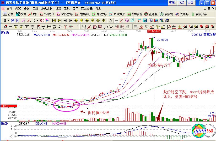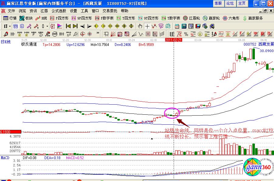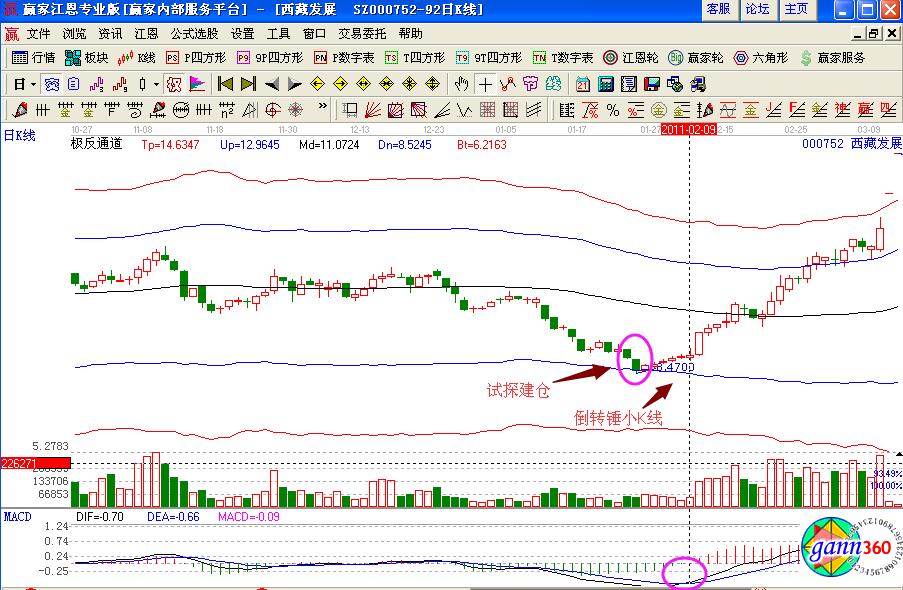 個股的走勢形態(tài)是通過案例進行分析的,同樣的倒轉(zhuǎn)錘小K線也是同樣的道理,如圖西藏發(fā)展(000752)在2011年2月初的股價走勢,是在極反通道藍色下軌線的位置,獲得支撐是一個試探性介入的點位,之后股價形成了連續(xù)向上拉升的幾個小陽線,同時形成的是倒轉(zhuǎn)錘小K線具有一定長度的上影線,其量能的走勢比較平緩,次日股價向上拉升形成漲停板,是投資者要捕捉的漲停板走勢形態(tài),同時macd指標形成了金叉買入的操作信號,可以積極的進行買入操作,但是生命線下方是弱勢區(qū)域,倉位不要過重。