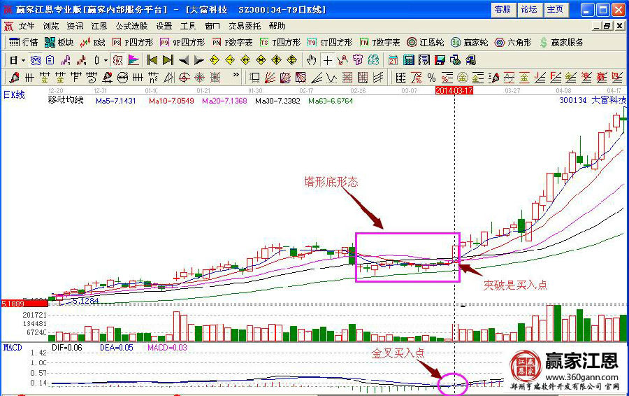 如圖大富科技(300134)在2013年底到2014年初的股價(jià)走勢形態(tài),在均線的簡單走勢配合中,前期的股價(jià)走勢是一直在低位橫盤整理的蓄勢形態(tài),雖然有緩慢的拉升,但是上漲的幅度不是很大,之后股價(jià)在14年3月份的時(shí)候形成了塔形底的形態(tài),在3月17日形成一根大陽線向上突破,對應(yīng)的成交量明顯的放大,說明有資金入場,macd指標(biāo)形成金叉買入的操作信號,均線多頭排列預(yù)示著上漲的操作行情,投資者可以積極的介入。