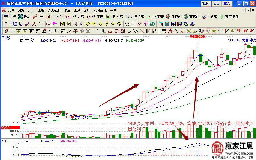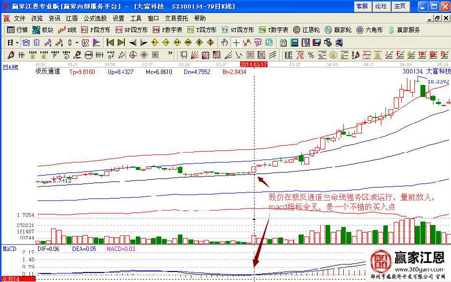 如果投資者不放心買點(diǎn)的位置,可以通過贏家江恩的極反通道進(jìn)行研判,如圖在14年3月17日的時(shí)候,股價(jià)以漲停陽線站穩(wěn)生命線并向上拉升,在強(qiáng)勢區(qū)域中運(yùn)行,量能不斷的放大,macd指標(biāo)金叉,是一個不錯的買入點(diǎn)位置。