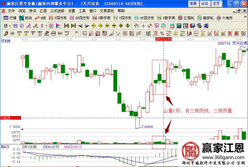 如圖天興儀表(000710)在2012年12月中旬的日K線走勢,股價(jià)形成了一個(gè)山形的三根陰線,同時(shí)對應(yīng)一個(gè)山形的三根陰量柱,但是對應(yīng)的macd指標(biāo)線是向上拉升的,其紅柱線也是在不斷的拉長,預(yù)示著短期內(nèi)上漲的操作行情,投資者可以積極的逢低介入。