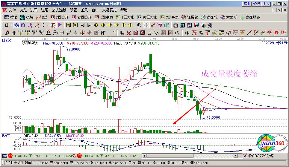 第一,成交量是技術(shù)分析中的核心標(biāo)準(zhǔn),分析成交量是出發(fā)點(diǎn),它有相對成交量和絕對成交量兩種概念,其中絕對成交量在一般情況下意義不大,只在新股上市第一天是重要參考指標(biāo),其后相對成交量是主要參考指標(biāo)。而相對成交量又分為相對均衡、極度放量、極度縮量三種情況。在日k線圖中,成交量變化反映了莊家操作過程,若散戶精力有限,就可以透過極度放量來判斷莊家行為。若發(fā)現(xiàn)成交量突然放大,就可以判斷出莊家在此有所動作。