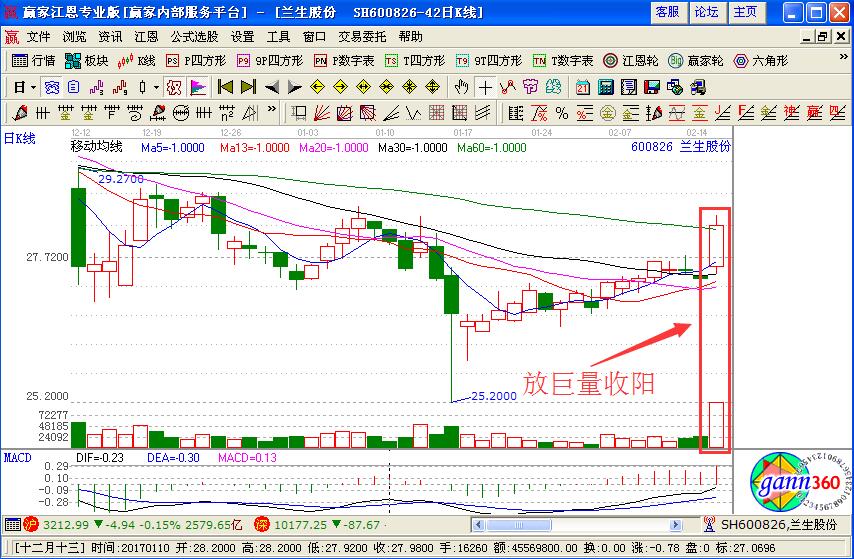 1.標準下降通道,突然爆發(fā)性放量拉高。這類股票大多有漂亮的下降通道,突然在某天放巨量收陽線(上圖所示),由此底部形成。