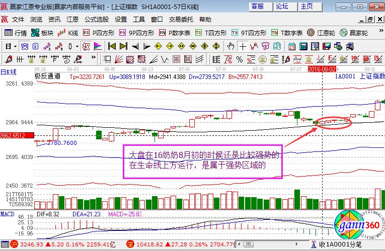 大盤的上證指數(shù)在2016年8月初的走勢中處于生命線上方的走勢形態(tài)(如上圖),其處于強(qiáng)勢區(qū)域,建議投資者可以選擇買入較強(qiáng)勢的個股,以生命線為標(biāo)準(zhǔn)點(diǎn)買入。