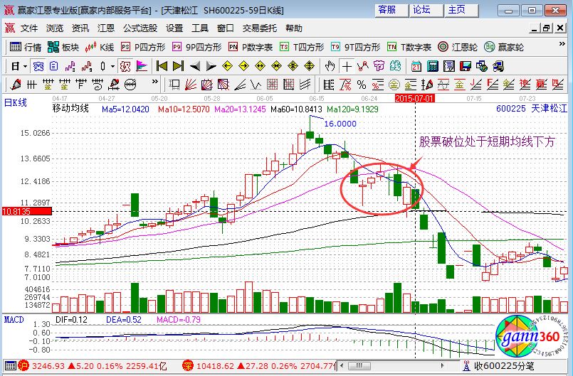 6、若股票出現(xiàn)破位走勢情況應(yīng)及時賣出,如下圖,股票的破位是走勢處于所有均線的下方,是股價在下跌過程中遇到反彈升高后又下跌至最低的情況,此時的走勢呈現(xiàn)死叉,一種弱勢運(yùn)行,為避免損失更多應(yīng)及時賣出。