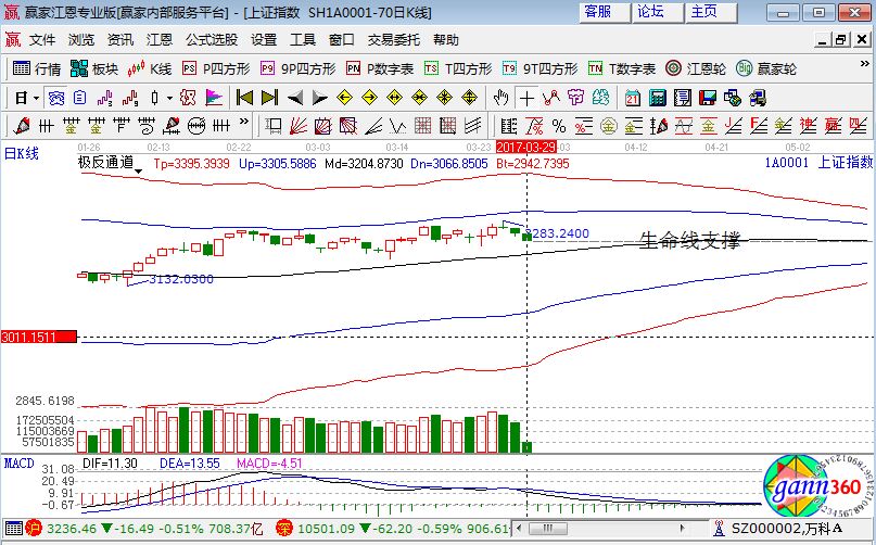 買入:個股達到了預(yù)期的支撐價位,做好買入準備。但要進一步保證買入的成功率,需結(jié)合具體的盤面走勢。若大盤當(dāng)日無大礙(上漲或震蕩),縮量跌到支撐位,盤口穩(wěn)健且日內(nèi)量、價、指標(biāo)等出現(xiàn)底背信號,則直接掛單買入;反之,若大盤走弱,放量跌破預(yù)期價位,則不要急于買入,耐心等待市場給出穩(wěn)健的買入信號再行動。如現(xiàn)在上證指數(shù)在極反通道指標(biāo)的生命線位置就是支撐位,如果跌破那么就要進入到弱勢了。