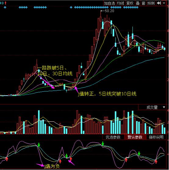 在kdj中,j值反應(yīng)最快,在做判斷的時候,更要關(guān)注j值的變化。當(dāng)股價連連跌破5日線、10日線以致20日線的時候。在第一次跌破20日線的時候一般為階段性底部,此時一旦j值在零軸以下,出現(xiàn)負值,此時我們應(yīng)該尤為關(guān)注。當(dāng)股價再次向上突破5日線的時候,股價必然會創(chuàng)出新高。而我們在這反彈到前高附近的利潤就可以拿到手。這個方法對于連續(xù)下跌的股票概率會更大。下面我們看這個股票。
