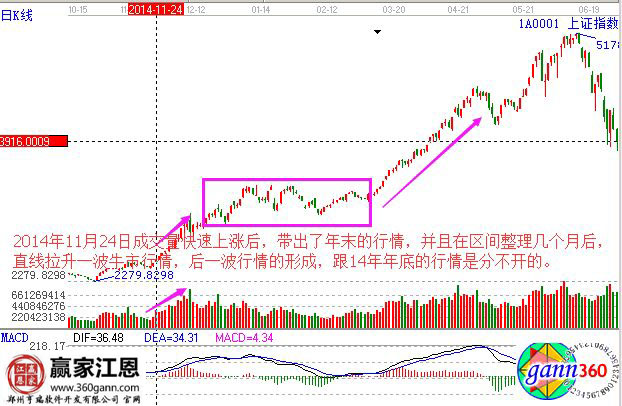 以大盤為例,在2014年11月24日大盤的成交量急速放大后引導(dǎo)了14年年末的行情。經(jīng)過三個月的箱體整理,隨著15年年初的成交量的更持久的一波行情,這跟14年年末的成交量的急劇增大是密不可分的。