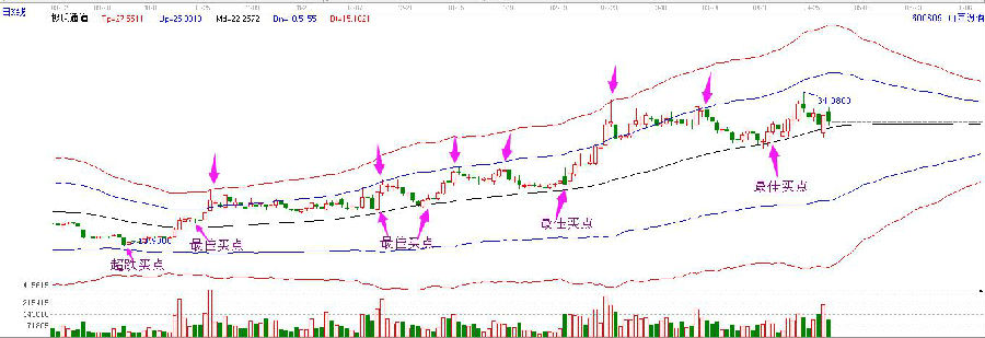 4.對(duì)選出來的量比大的個(gè)股,做好技術(shù)分析,均線系統(tǒng)也好,MACD分析也好或是其他的分析方法,當(dāng)技術(shù)分析上,個(gè)股也符合操作的條件,那成功率當(dāng)然更高。贏家江恩軟件的快速篩選個(gè)股工具為極反通道,即生命線(中間黑色曲線)附近為最佳買點(diǎn)。如下面山西汾酒的走勢圖,歷史上很多次的拉升,都可以看做是從生命線開始的,到達(dá)壓力位不突破,形成賣點(diǎn).