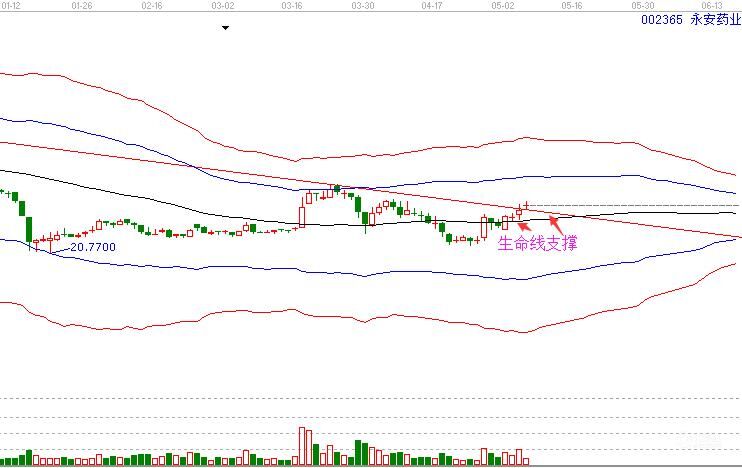 從上面的圖形我們可以看到這只個(gè)股非常的符合極反通道走勢(shì),而且在大盤下跌有一段時(shí)間后,接近藍(lán)色下軌線支撐附近的時(shí)候,這只股仍然是處于生命線位置震蕩,在趨勢(shì)上是強(qiáng)于很多個(gè)股的,大盤一旦反彈,這種個(gè)股也是非??焖俚母S者,那為了確認(rèn)趨勢(shì)的轉(zhuǎn)變,可以在畫出一條趨勢(shì)線作為趨勢(shì)轉(zhuǎn)變的輔助分析,入上圖所示,顯然調(diào)整位置到達(dá)生命線收回,并且重新站回趨勢(shì)線之后,在5月10日型號(hào)曾了共振點(diǎn),開(kāi)始了這波上漲。