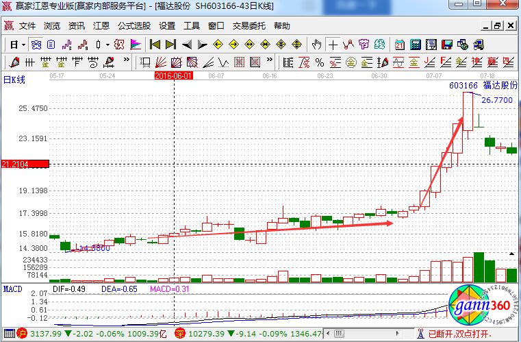 這只股份從18元漲到27元,這一波上漲了40%,我們再來看底下的成交量,下方的成交量放大了,而且它的換手率最大的在20%以上,這么大的量,這么大的換手率,顯然之資金的推動型。