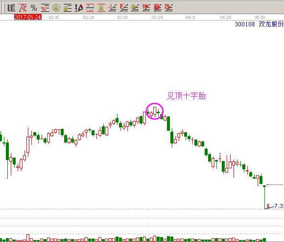 對于長十字星是指具有比較長的上下影線的十字星,對于這個長度沒有沒有明確的規(guī)定,原則上能夠碰到前幾日的高點或者低點就可以被認(rèn)為是長十字。在上漲的后期出現(xiàn)長十字的時候,趨勢出現(xiàn)沒有方向的走勢,往往是下跌的開始。在底部出現(xiàn)長十字的時候效果并不是很明顯,能夠真正見底還需要之后的K線的走勢配合。見頂?shù)拈L十字比較常見,如下圖: