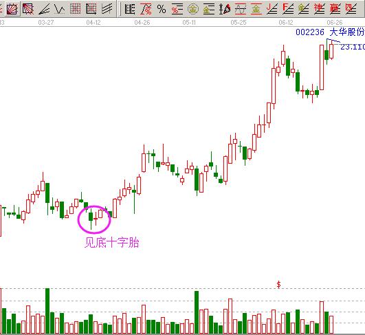 在下跌時候出現(xiàn)中大陰線,隨后出現(xiàn)跳空高開并出現(xiàn)十字走勢,為重要的見底信號。