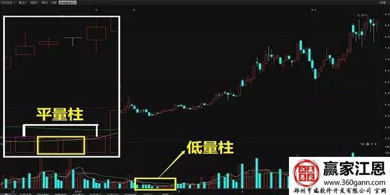 我們運(yùn)用股票軟件所選出的一只股票的截圖。這一只股票,當(dāng)人本人運(yùn)用這兩種量柱的方法輕松拿到了40個(gè)點(diǎn)。圖中黃框內(nèi)的位置其實(shí)就是很多人說(shuō)的量坑位置,在這個(gè)位置的成交來(lái)滾你是非常小的,所以就是低量柱,它是成交量最小的一個(gè)階段,這根量柱是市場(chǎng)起漲的先兆。白框內(nèi)黃色小框里的兩根量注基本上是一樣的,所以說(shuō)就是平量柱。