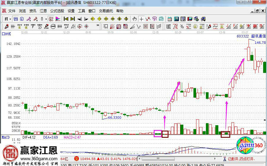 所謂的黑馬量柱就是平量柱+低量柱。具體的描述就是即使平量柱又是低量柱的,低量柱和平量柱是相鄰的。這些都是主力已經(jīng)高度控盤的表現(xiàn),是非常容易產(chǎn)生黑馬的,所以值得關(guān)注。接下來(lái)看超訊通信的走勢(shì)圖。