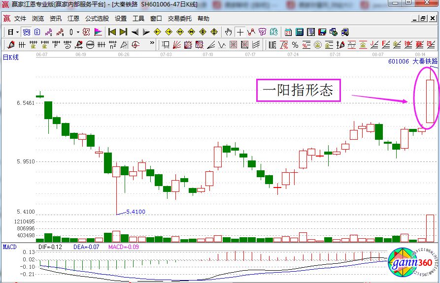 上圖是中南重工在2013年8月份的走勢圖,該股前期在經(jīng)過一波下跌之后,在低位形成了緩慢爬升的個股,圖中該股在8月8日股價放量拉升,而且成交量相比前幾日明顯的放大,這樣就是形成了比較典型的一陽指形態(tài)。所以在當(dāng)天尾盤股價放量上攻漲勢確立后果斷的以7.46元的價位進(jìn)行買入,在次日以4.59元的價位賣出,盈利1.56%。