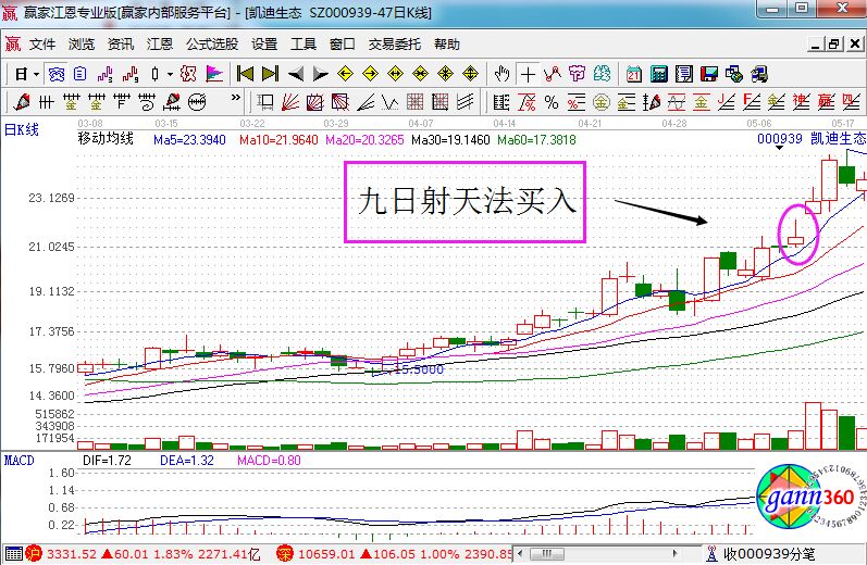 上圖是凱迪生態(tài)在2011年5月份的走勢(shì)圖,圖中當(dāng)時(shí)在5月10日的時(shí)候股價(jià)走出一根上影K線,而且我們可以看到股價(jià)遭遇空頭狙擊出現(xiàn)而出現(xiàn)的長(zhǎng)上影線,第二天股價(jià)繼續(xù)上攻型了標(biāo)準(zhǔn)的九日射天。在整個(gè)形態(tài)形成的過(guò)程中,股價(jià)的上行趨勢(shì)是沒(méi)有改變的,所以就在當(dāng)天以21元的價(jià)位進(jìn)行買(mǎi)入,并在13日22.08元的進(jìn)行賣(mài)出,獲利8.5%。