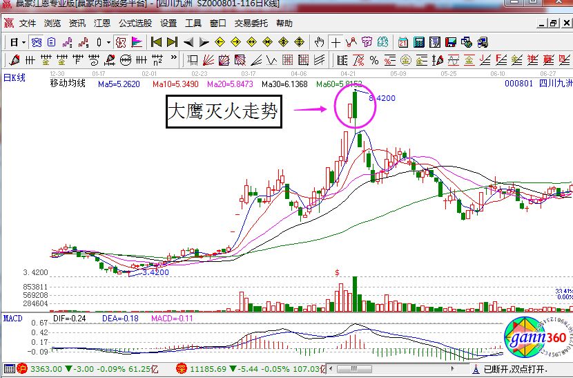 大鷹滅火走勢(shì)是怎么樣的?從名字上來(lái)看的是股價(jià)出現(xiàn)陰線的速度是非??斓莫q如老鷹獵捕食物的樣子。那究竟K線是怎么樣的體現(xiàn)呢?具體的走勢(shì)定義就是:股票在經(jīng)過(guò)連續(xù)的漲停之后,已經(jīng)凸顯出了賺錢的效應(yīng)了,當(dāng)然很多的散戶追漲的熱情是非常高的,突然有一個(gè)巨大的陰線吧投資者火辣的熱情給澆滅了,顯然是股價(jià)見(jiàn)頂,之后會(huì)快速的回落。接下來(lái)我們就來(lái)看四川九洲的K線走勢(shì)圖。