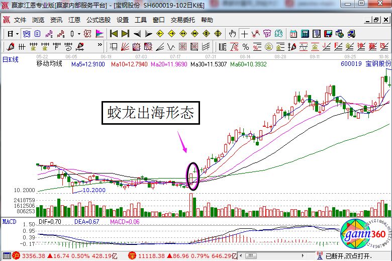 上面是寶鋼股份在2007年7月的日K線走勢圖,從上圖我們可以看到,該股在經(jīng)過了長期的盤整之后,走出了蛟龍出海的均線形態(tài),在接下來的便是穩(wěn)步的拉升和上揚,同時在出現(xiàn)該形態(tài)的當天伴隨著非常的大的成交量,所以它在后面的走勢才會更加的強勁。