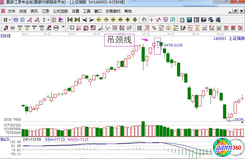 成交大量后吊頸,空方馬上來(lái)帶領(lǐng)。所以它是一種見(jiàn)頂信號(hào),特別是之前有過(guò)大成交量的陽(yáng)線拉升之后出現(xiàn),實(shí)體短影線長(zhǎng),影線長(zhǎng)度至少是實(shí)體兩倍。這種K線一般都是莊家震蕩型洗盤(pán)。