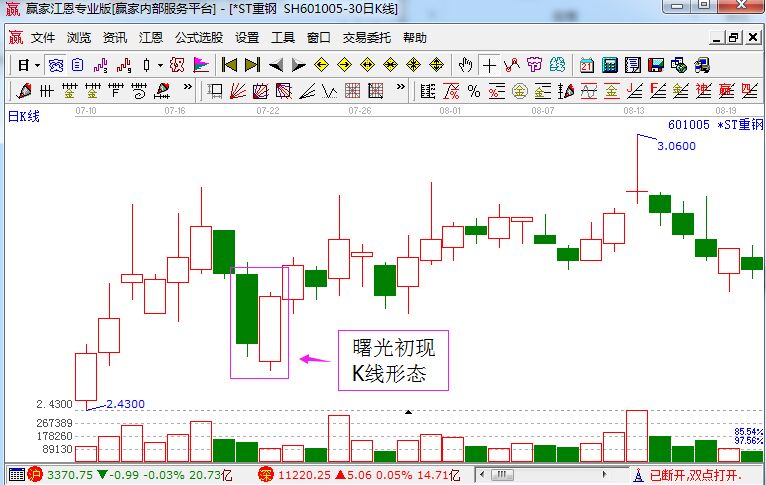 一般來(lái)說(shuō),曙光初現(xiàn)組合形態(tài)通常是出現(xiàn)在股價(jià)向下的趨勢(shì)當(dāng)中,第二天伴隨著股價(jià)的低開(kāi),可能意味著最后的空頭終于下定決心賣(mài)出自己手上的股票,隨后市場(chǎng)便發(fā)生轉(zhuǎn)變,轉(zhuǎn)為了上升的行情。在第二天的長(zhǎng)陽(yáng)K線,意味著市場(chǎng)價(jià)格下跌動(dòng)力耗盡,空方策劃的最后一番攻擊失利,顯然多方已經(jīng)控制了大的局面。