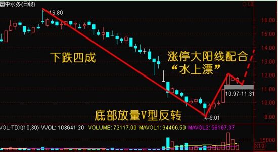國中水務的走勢中,股價處于底部啟動的形態(tài),首先該股是超跌,該股在下跌的幅度大約是在四成左右,然后下跌到末段出現了量價背離,底部放量,打到9元之后開始V型反轉,這個在個股當中是最強的反轉形態(tài)。伴隨著前期兩根漲停的是量能的逐步放大。2011年10月31號的跳空缺口形成了水上漂形態(tài)。