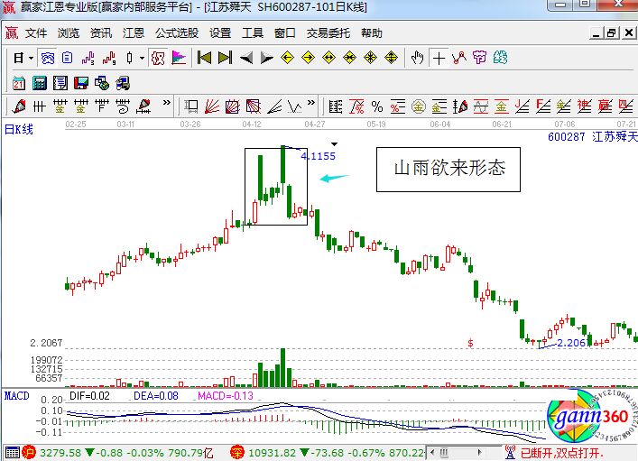 上圖是江蘇舜天的走勢圖,圖中該股形成的非常典型的山雨欲來走勢形態(tài),我們看到在該形態(tài)之后股價形成了幾根的陰線,之后開始跌皮前面K線的位置,形成了下跌的趨勢,顯然該形態(tài)是一個非常典型的賣出信號。