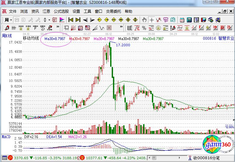 個(gè)股走勢(shì)中的30日均線是非常重要的,在股價(jià)上升的時(shí)候它是條支撐底線,個(gè)股下挫后反彈它又是條阻力線,如果個(gè)股在下調(diào)后企穩(wěn),向上反彈時(shí)沖擊30日均線明顯有壓力,上攻30日均線時(shí)成交量也沒(méi)有放大配合,股價(jià)在沖擊30日均線時(shí)留下的上影線較長(zhǎng)(表明上檔阻力強(qiáng)),那么投資者可以進(jìn)行及時(shí)的減磅,如下面的智慧農(nóng)業(yè)走勢(shì)圖。