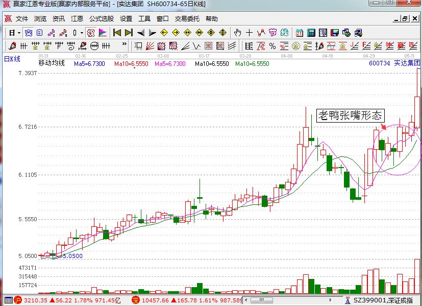 對于老鴨頭形態(tài)相信大家已經(jīng)了解了,其中還有一個(gè)形態(tài)就是老鴨張嘴形態(tài),它的技術(shù)特征是:5日線和10日線形成金叉反散之后,5日線在靠近10日均線但是還沒有到10日均線的時(shí)候就會重新拐頭向上方運(yùn)行,形成的圖形就是老鴨張嘴形態(tài)。接下來我們就來看實(shí)達(dá)集團(tuán)的案例圖形。