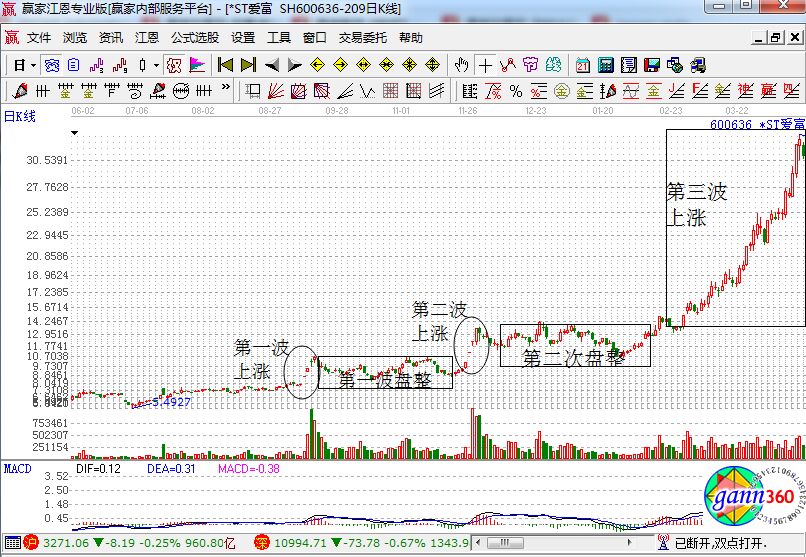 由上圖我們可以看到,該股的第一波和第二波上漲都是以三個漲停板的方式上漲的,其漲勢不可謂不強,但是因為該股題材始終是處于朦朧的狀態(tài),所以,賣壓也是非常大的,所以在這兩波上漲之后,股價不僅僅下跌比較多,而且盤整的時間是非常長的,差不多都是兩個多月。