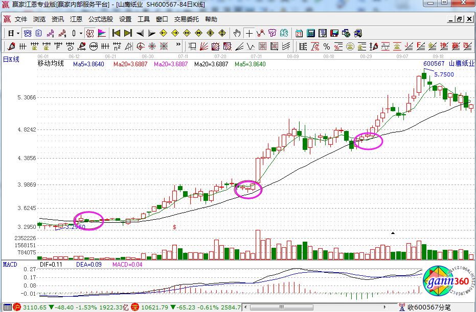 在了解過注意事項(xiàng)之后,那么怎么樣運(yùn)用均線捕捉波段機(jī)會(huì)?在波段應(yīng)用中,20日均線相對來說是一根中期均線,比較適合作為波段參照,這根均線一旦確立方向,波段指引方向就會(huì)比較明確。而5日均線又比較靈敏,利于作為買點(diǎn)參考,所以兩者配合很有效。如下面的山鷹紙業(yè)走勢圖。