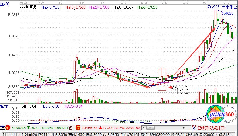 在這之后,K線開始反彈回轉(zhuǎn),均線當然也出現(xiàn)了拐頭的走勢,同時5日均線開始長虹攢10日均線,形成金叉,之后5日均線再上穿20日均線,形成金叉,最后是10日均線上穿20日均線,就形成了一個三角形,一般三角形支撐著上方的中陽線或大陽線,同時常常伴隨著成交量的放量,這其實就是平衡藏我們所說的價托。