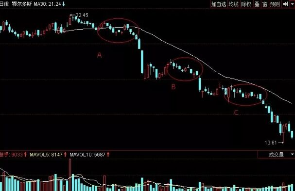 上圖是鄂爾多斯股票軟件中歷史上部分日K線走勢圖,從圖中我們可以看到,該股先是高開,然后開始在高位震蕩盤整。在A處,股價出現(xiàn)了綿綿陰跌的看跌信號,股價快速下跌杭州,又開始反彈,但反彈比較弱,隨后又出現(xiàn)綿綿陰跌形看跌信號,即B處。雖然股價已經(jīng)下跌了很多,但是還是要進行出局的,否則就會被套的更深,在C處股價先是橫向盤整,然后又出現(xiàn)綿綿陰跌形看跌信號,此時投資者應(yīng)清倉出局,短時間內(nèi)不要碰該股票為好。