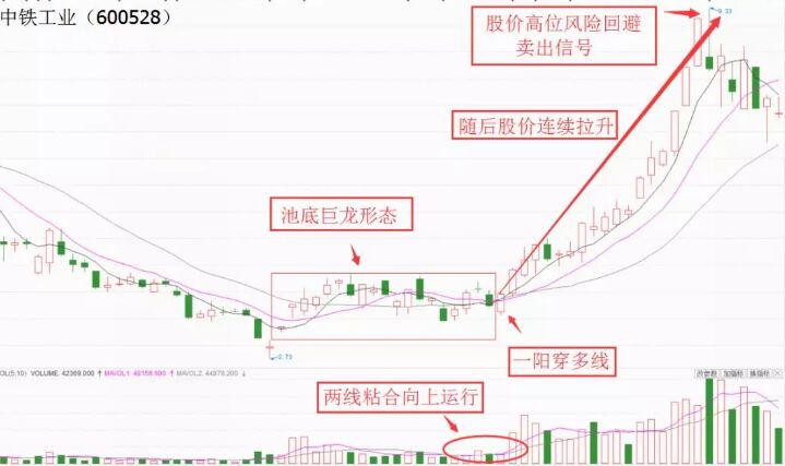 從上圖中我們可以看出中鐵工業(yè)在10月23日的股價走勢變化,它是處于橫盤低走的形態(tài)。在這個過程中的走勢股價是處于低位的池底區(qū)域,成交量與前期的量能相比較就是萎縮的形態(tài),但是在股價出現(xiàn)了一個陰線十字星走勢之后,成交來個能呈現(xiàn)的是溫和的放大,并且是以一根陽線上穿短期均線,這樣就形成了一陽穿三線的走勢形態(tài)。