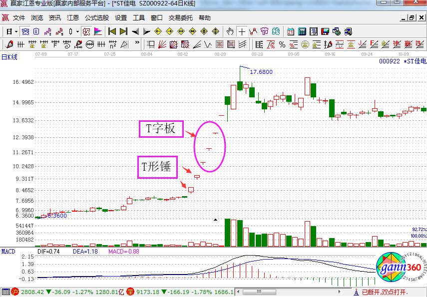上圖是*ST佳電股份在2014年7月至10月的走勢(shì),股價(jià)在前一個(gè)平臺(tái)做短暫調(diào)整后,以T形錘、T字板的方式直線拉升七個(gè)漲停板。股價(jià)也從平臺(tái)其的不足8元到高出的15元以上,走出了翻倍的行情,而且所用的時(shí)間不足10天。