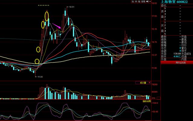 打開股票軟件調(diào)出上海物貿(mào)在去年11月份的走勢,從圖中偶們可以看到股價前面先后是出現(xiàn)了4個漲停板基因的,在2017年11月13日時當(dāng)天股價呈現(xiàn)了高開異動上漲,同時對比前一天成交量的話,當(dāng)天呈現(xiàn)明顯的放大,如圖中粉紅色箭頭所指的那根K線。在走勢中沒有下探回補當(dāng)天跳空高開的缺口,在第二天股價就呈現(xiàn)出了漲停。