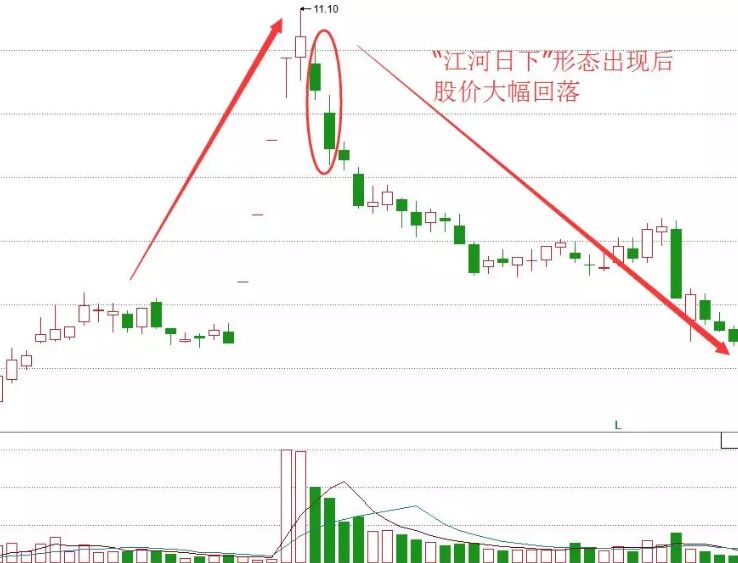 價(jià)格處于大幅上漲或者階段性反彈的高位區(qū)域;第一個(gè)交易日,分時(shí)圖上出現(xiàn)低開低走,形成一根中陰線或者大陰線。低開低走后的第二個(gè)交易日,股價(jià)直接放量低開。后市呈現(xiàn)立即反彈,但是價(jià)格中心始終低于第一根低開低走的陰線,那么就說明了江河日下形態(tài)已經(jīng)確立。