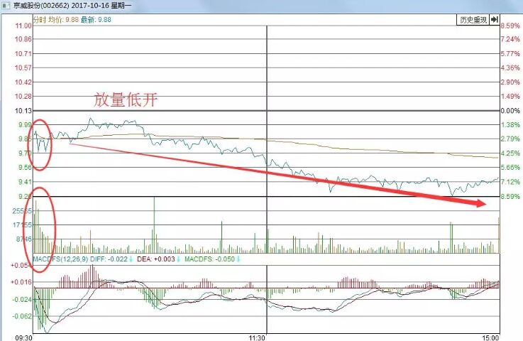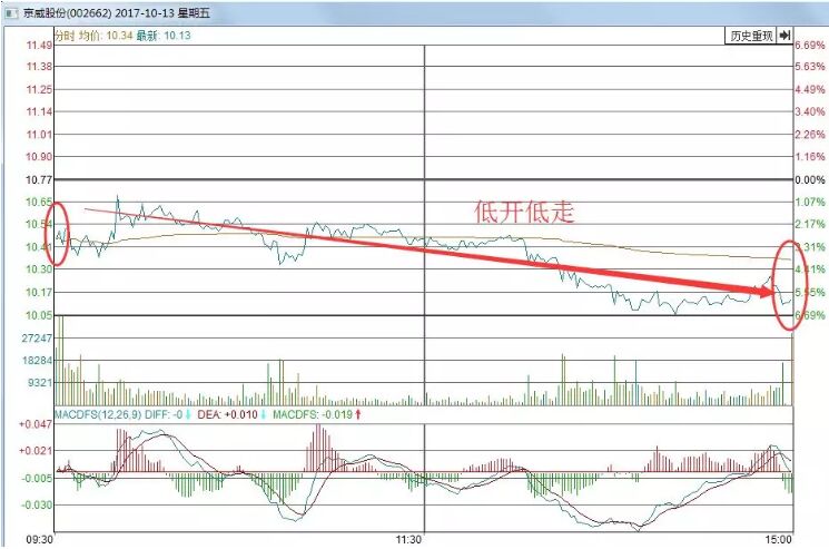 在2017年10月13日出現(xiàn)了低開低走的分時(shí)走勢(shì),此時(shí)就要開始特別謹(jǐn)慎,如下圖。
