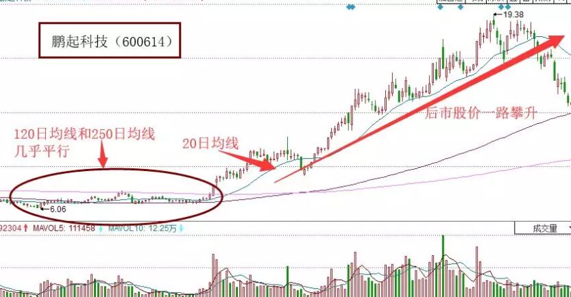 1、 并線三線開花。它指的就是在三線開花的初始點(diǎn),120日均線與250均線是處于極度接近的平行狀態(tài),此時(shí)20日均線從下向上穿越這兩條均線的技術(shù)走勢(shì),形成均線的金叉穿越。穿越后如果股票價(jià)格走勢(shì)在出現(xiàn)大幅放量的上漲行情,就預(yù)示著并線三線開花走勢(shì)的成立,并將預(yù)示著均線系統(tǒng)將要“開大花”。它隱含的技術(shù)意義就是股票價(jià)格要上行。如下面的鵬起科技走勢(shì)圖。