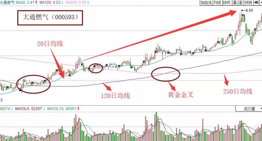 2、 順向三線開花。它指的就是在三線開花的初始點(diǎn),120日均線與250日均線是順向交叉狀態(tài),即120日均線從下向上穿越250日均線,形成兩條長(zhǎng)期均線的黃金交叉,此時(shí)20日均線從下向上穿越這兩條均線交叉點(diǎn)的技術(shù)走勢(shì)形態(tài)。這種走勢(shì)形態(tài),在穿越的過程中成交量是有效放大,那就預(yù)示著該形態(tài)的走勢(shì)成立,當(dāng)然這個(gè)方法并不能讓我們買在啟動(dòng)的最低點(diǎn),但是我們可以在交叉點(diǎn)的當(dāng)日發(fā)現(xiàn)它的趨勢(shì),這樣就可以做到獲利,如下面的大通燃?xì)庾邉?shì)圖。