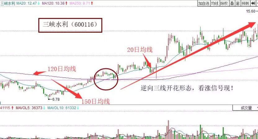 3、逆向三線開花。它指的就是在該形態(tài)的初始點(diǎn),120均線與250日均線形成死亡交叉,此時(shí)20日均線由下向上穿越這個(gè)交叉點(diǎn)的技術(shù)走勢(shì)形態(tài)。一般股票形成這個(gè)走勢(shì)的話,就預(yù)示著個(gè)股將要走牛,同時(shí)應(yīng)該有成交量有效放大的支持。如下面的三峽水利走勢(shì)圖。