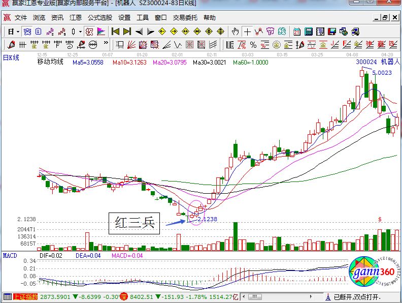 上圖是機(jī)器人在歷史上的走勢(shì)圖,從圖中我們可以看到,這指一個(gè)經(jīng)典的底部,先是倒錘子線(xiàn)和底部大量組合,隨后出現(xiàn)了金針探底完成了底部的確認(rèn),最后是一個(gè)紅三兵多方炮,最終股價(jià)完成了漂亮的V形反轉(zhuǎn)。底部出現(xiàn)紅三兵后股價(jià)在11個(gè)交易日漲幅67%,威力可見(jiàn)一斑,而且這個(gè)股票均線(xiàn)和趨勢(shì)最佳買(mǎi)點(diǎn)同時(shí)出現(xiàn),顯然就這樣就給大家?guī)?lái)了很多買(mǎi)入的機(jī)會(huì)。