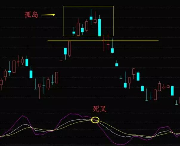 到此,跳空高開和跳空低開缺口基本在相同價(jià)格附近,缺口形成了一個(gè)隔離帶,將頂部K線與下方K線隔開,頂部的盤整K線好似一座小島,孤立于海洋之間,所以就被稱作是頂部島型。