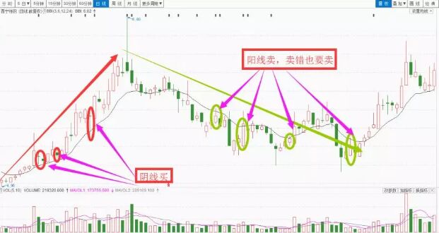 陰陽線戰(zhàn)法的具體步驟為:第①步,選擇上升趨勢(shì)良好的個(gè)股;第②步,線上陰線買;第③步:線下陽線賣。