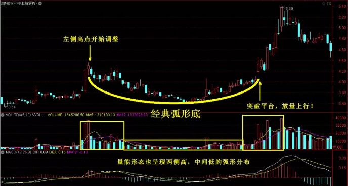 3、 圓弧底形成末期,股價迅速上揚形成突破,成交量也是顯著的放大,股價漲升迅猛,往往很少回檔整理,實際上,圓弧底形成的時間一般比較長,從形態(tài)上也比較好辨認(rèn),一旦個股出現(xiàn)了圓弧底,通常就是到達(dá)了這只個股的底部,圓弧底形態(tài)形成的時間越長,那么這只股的股價上升的幅度也就越大。