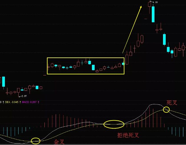 下圖是春興精工在歷史上的部分截圖,從圖中我們可以看到,股價(jià)在經(jīng)過(guò)了長(zhǎng)期下跌之后,從低位進(jìn)行回升,而macd形成金叉,之后股價(jià)進(jìn)行盤(pán)整,macd也止住上升走勢(shì),白線下行與黃線粘合,想要形成死叉,結(jié)果粘合許久竟然沒(méi)有形成死叉,結(jié)果有轉(zhuǎn)頭向上了,還形成了一波比較強(qiáng)的走勢(shì),此處macd的狀態(tài)就是“拒絕”形態(tài)的中的拒絕死叉。