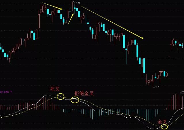 如上圖所示,股價(jià)經(jīng)過(guò)了一段時(shí)間的上漲,已經(jīng)是處于相對(duì)的高位了,股價(jià)已經(jīng)是無(wú)力上漲了,所以開(kāi)始下跌,macd白線下穿黃線形成死叉,此后股價(jià)很快進(jìn)行反彈再次沖擊前高,macd欲形成金叉,但白線剛觸及黃線,股價(jià)即無(wú)力下跌,金叉尚未形成,白線再度下跌,由此形成“拒絕金叉”,此后股價(jià)與MACD雙線均一路向下,走出下降趨勢(shì)。