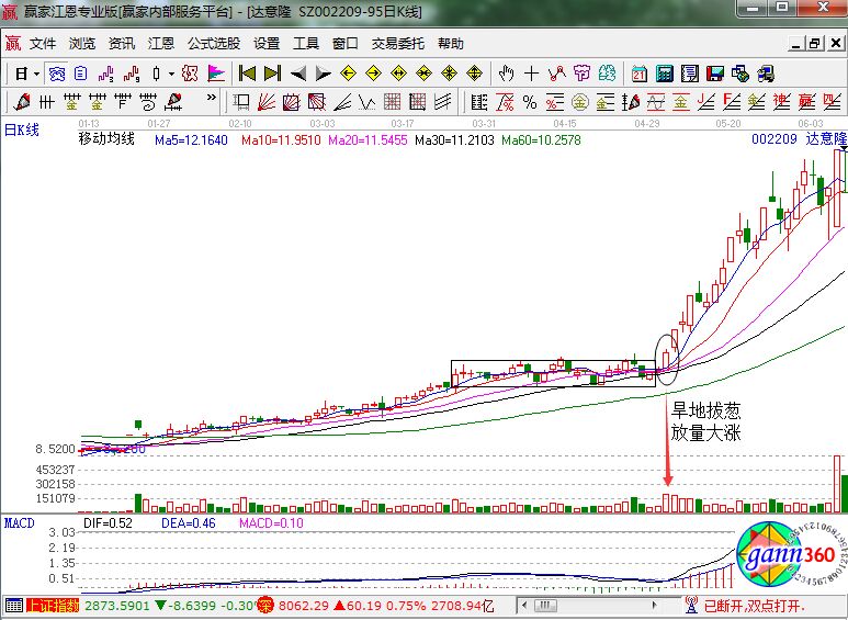 旱地拔蔥是一個成語,它其實指的就是短時間的發(fā)展態(tài)勢一下子上升,所以它通常用來至突然發(fā)生的變化。運用到股市中,當然指的就是股價從低位到高位的拉升走勢了,所以它也是一種預(yù)示后市上漲的走勢。具下面我們就結(jié)合達意隆的K線走勢來幫助大家識別旱地拔蔥形態(tài)。